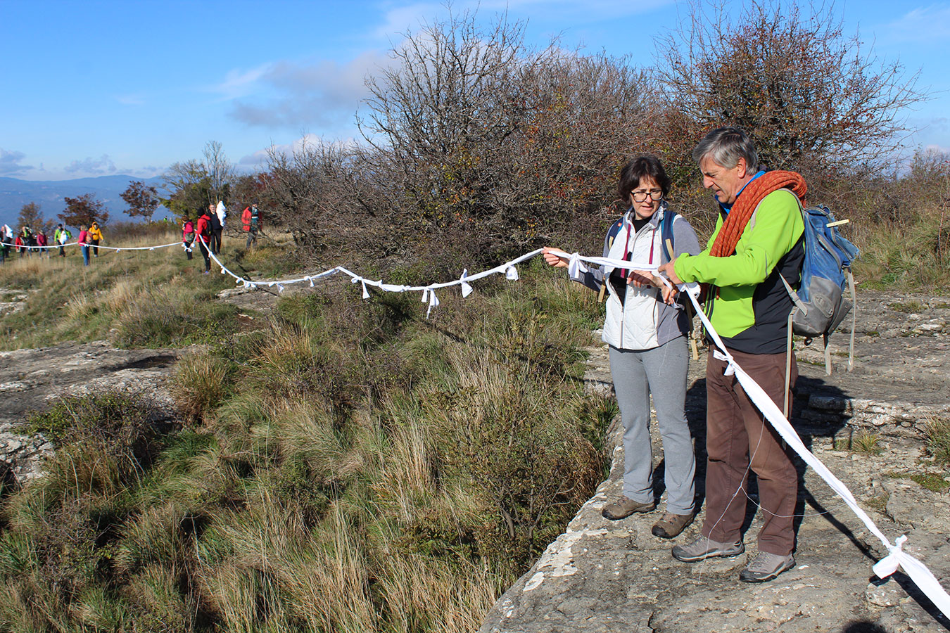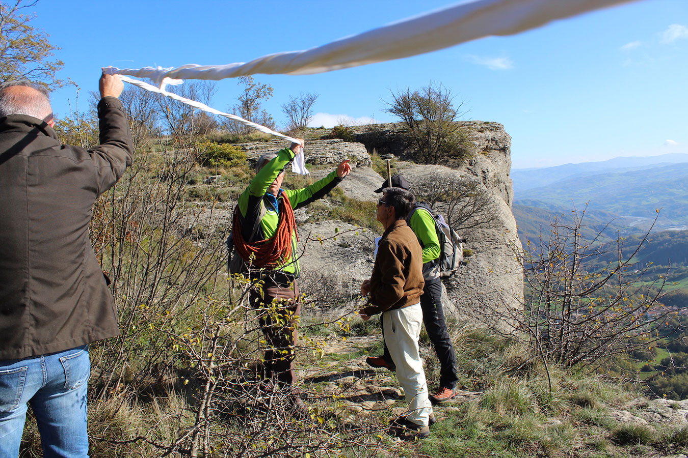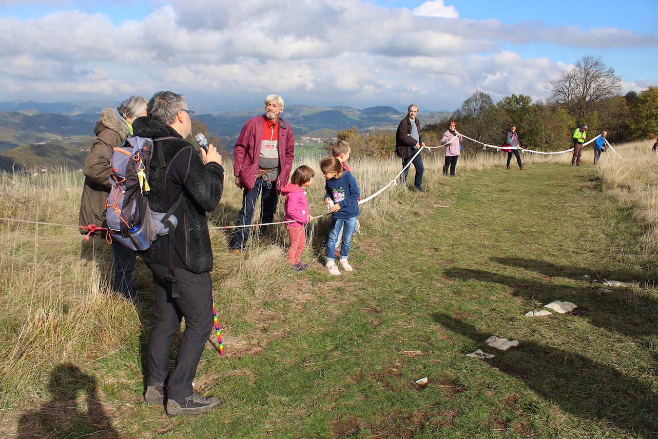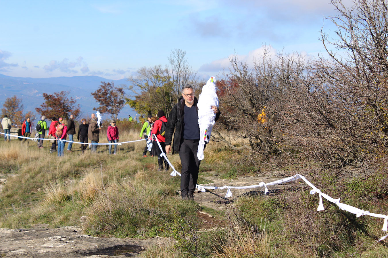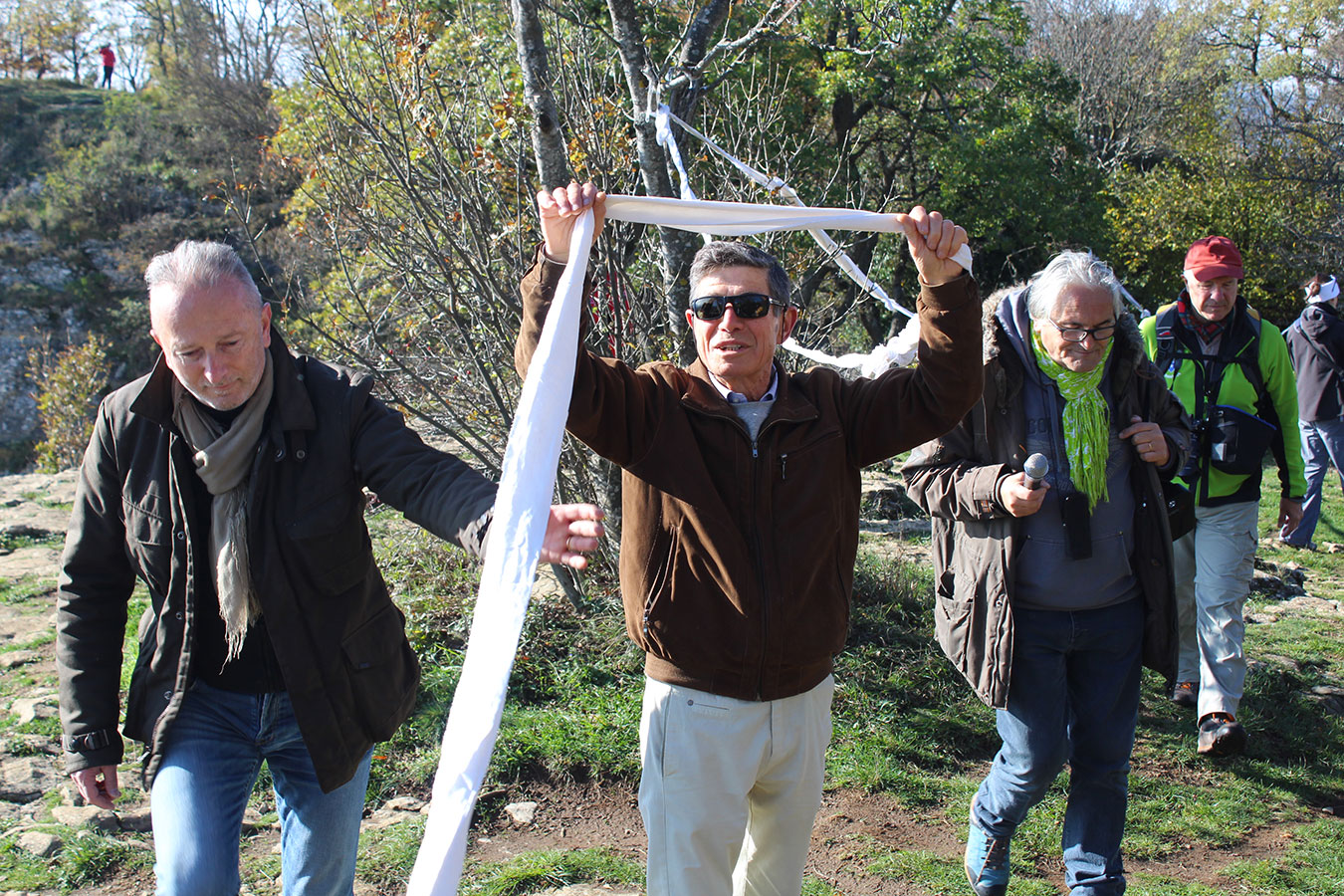 Una bella giornata di sole, non troppo fredda, ha rappresentato il contesto ideale per l’evento “Legarsi alla Pietra”, che si è svolto domenica mattina a Bismantova. Da un’idea dell’artista Ermanio Beretti, è nato questo evento di “arte relazionale”, che è stato insieme anche di Land Art, e che ha coinvolto circa 100 persone nel ruolo di “performer”, chiamati a sorreggere 3 km di una “fune povera” realizzata con lenzuola, vecchie corde, funi da arrampicata annodate, realizzata nelle scorse settimane con ben 1500 nodi. La performance ha preso corpo sul Pianoro sommitale della Pietra di Bismantova la vigilia del giorno dedicato a San Martino. “Siamo stati fortunati” ha spiegato Ermanio alla chiusura dell’ultimo nodo che ha chiuso il cerchio. “Come dice il vecchio adagio contadino l’estate di San Martino dura tre giorni e un pochino, così abbiamo avuto in dono un giorno limpidissimo e insieme ci siamo annodati e accordati a questo luogo, simbolo di una relazione profonda tra sacro e natura. Ricordiamoci che ogni modo corrisponde a un pensiero: oggi ne possiamo formulare tanti, tornando a casa. Sono infatti 1500 i nodi che ho fatto alle vecchie lenzuola”. La gente ha risposto alla chiamata e in circa cento persone si sono radunate in piazzale Dante verso le 10 del mattino. Afferma l’assessore alla Cultura di Castelnovo, Emanuele Ferrari: “All’evento erano presenti le due sezioni CAI di Castelnovo Monti e Reggio Emilia, alcuni esponenti dei Gruppi di Cammino, appassionati di trekking, giovani e famiglie, insegnanti e le due dirigenti delle scuole superiori, cittadini che insieme a Ermanio hanno srotolato 3 km di lenzuola ridotte in strisce e annodate, offerte gentilmente dalla ditta Ellebi di Luca Benassi. Molti anche i contributi di persone accorse sul posto con bende, vecchie corde, anche da arrampicata: tra tutti il materiale più originale è stato senza dubbio costituito da vecchie fasce da neonato ricamate: su una di queste, proprio in prossimità del nodo finale, la scritta “Cuor Mio”, a chiudere anche simbolicamente il cerchio di una giornata che probabilmente continuerà a battere davvero nel cuore di ciascuno dei partecipanti”.