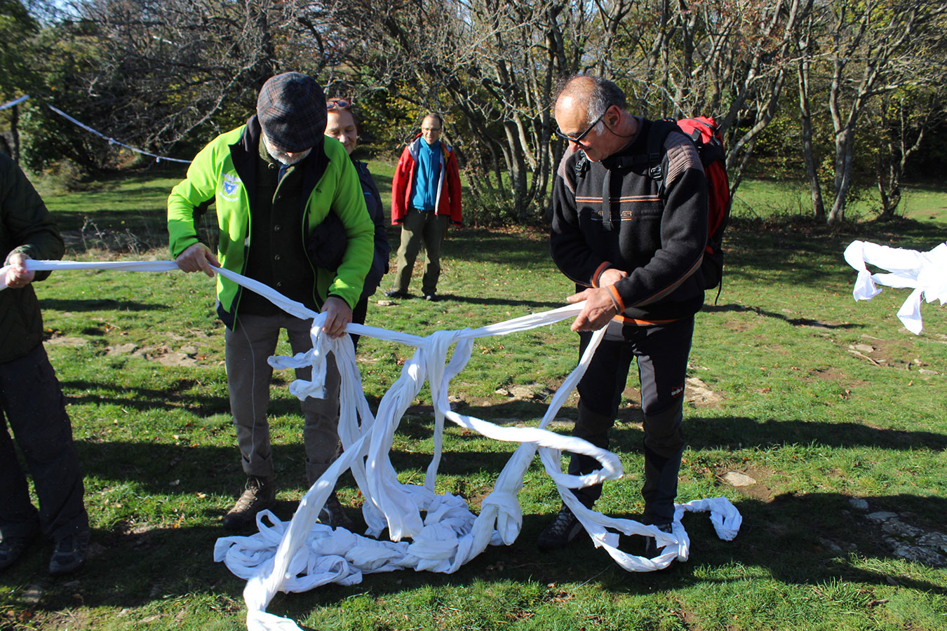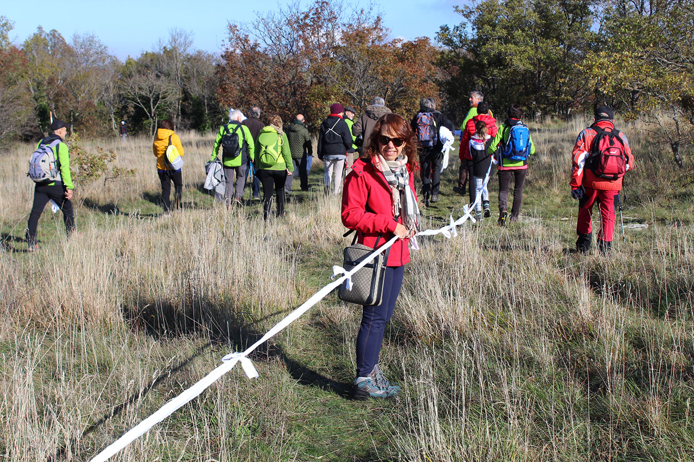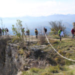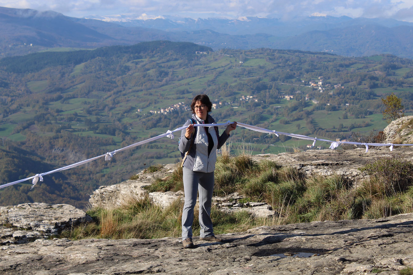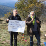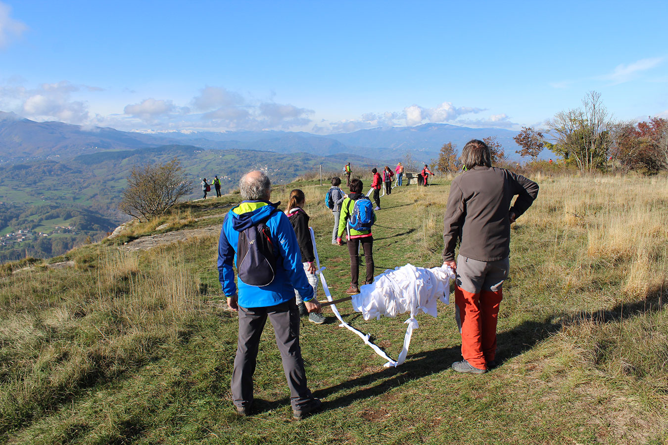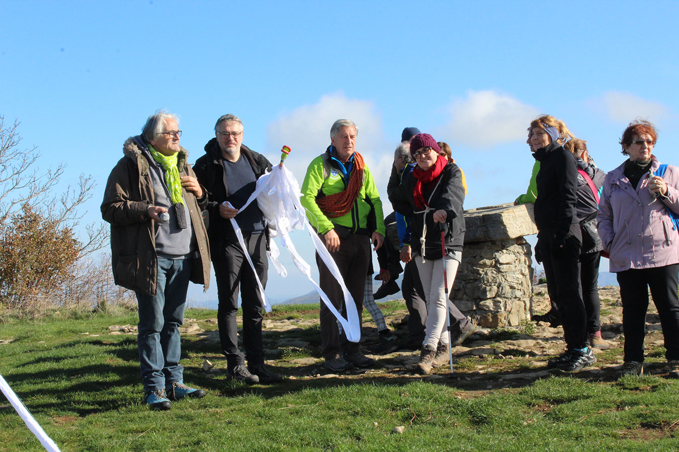 Una bella giornata di sole, non troppo fredda, ha rappresentato il contesto ideale per l’evento “Legarsi alla Pietra”, che si è svolto domenica mattina a Bismantova. Da un’idea dell’artista Ermanio Beretti, è nato questo evento di “arte relazionale”, che è stato insieme anche di Land Art, e che ha coinvolto circa 100 persone nel ruolo di “performer”, chiamati a sorreggere 3 km di una “fune povera” realizzata con lenzuola, vecchie corde, funi da arrampicata annodate, realizzata nelle scorse settimane con ben 1500 nodi. La performance ha preso corpo sul Pianoro sommitale della Pietra di Bismantova la vigilia del giorno dedicato a San Martino. “Siamo stati fortunati” ha spiegato Ermanio alla chiusura dell’ultimo nodo che ha chiuso il cerchio. “Come dice il vecchio adagio contadino l’estate di San Martino dura tre giorni e un pochino, così abbiamo avuto in dono un giorno limpidissimo e insieme ci siamo annodati e accordati a questo luogo, simbolo di una relazione profonda tra sacro e natura. Ricordiamoci che ogni modo corrisponde a un pensiero: oggi ne possiamo formulare tanti, tornando a casa. Sono infatti 1500 i nodi che ho fatto alle vecchie lenzuola”. La gente ha risposto alla chiamata e in circa cento persone si sono radunate in piazzale Dante verso le 10 del mattino. Afferma l’assessore alla Cultura di Castelnovo, Emanuele Ferrari: “All’evento erano presenti le due sezioni CAI di Castelnovo Monti e Reggio Emilia, alcuni esponenti dei Gruppi di Cammino, appassionati di trekking, giovani e famiglie, insegnanti e le due dirigenti delle scuole superiori, cittadini che insieme a Ermanio hanno srotolato 3 km di lenzuola ridotte in strisce e annodate, offerte gentilmente dalla ditta Ellebi di Luca Benassi. Molti anche i contributi di persone accorse sul posto con bende, vecchie corde, anche da arrampicata: tra tutti il materiale più originale è stato senza dubbio costituito da vecchie fasce da neonato ricamate: su una di queste, proprio in prossimità del nodo finale, la scritta “Cuor Mio”, a chiudere anche simbolicamente il cerchio di una giornata che probabilmente continuerà a battere davvero nel cuore di ciascuno dei partecipanti”.