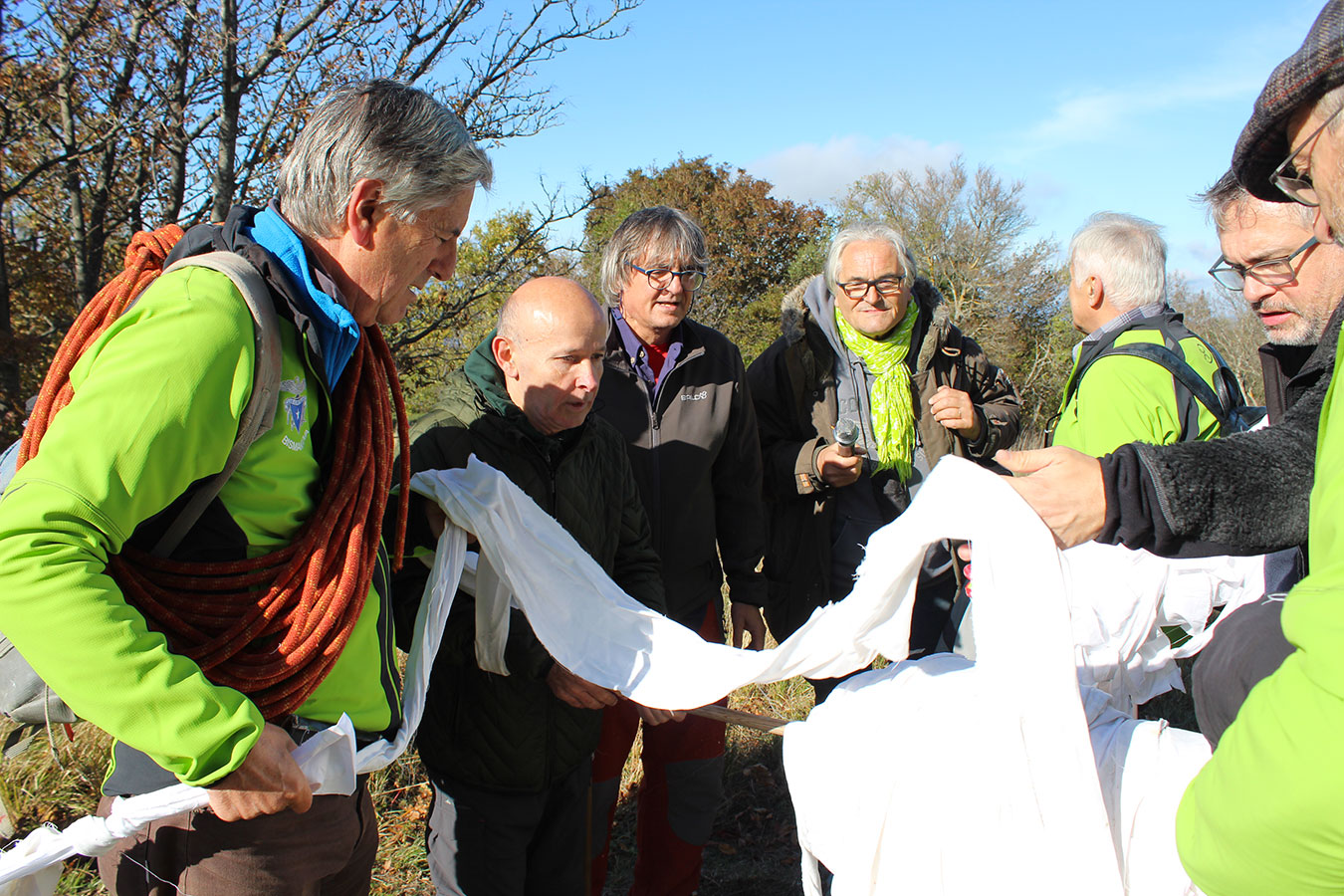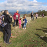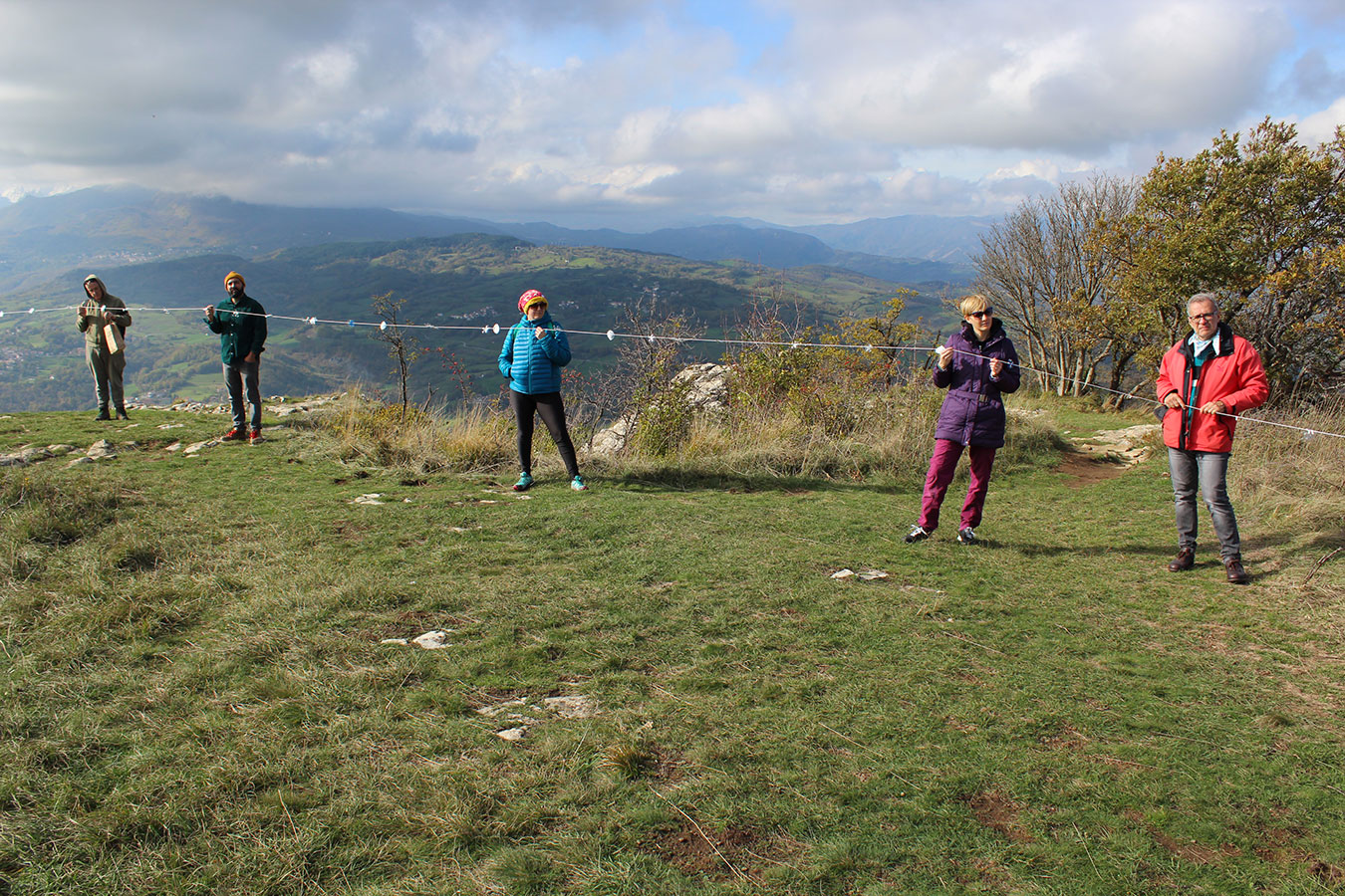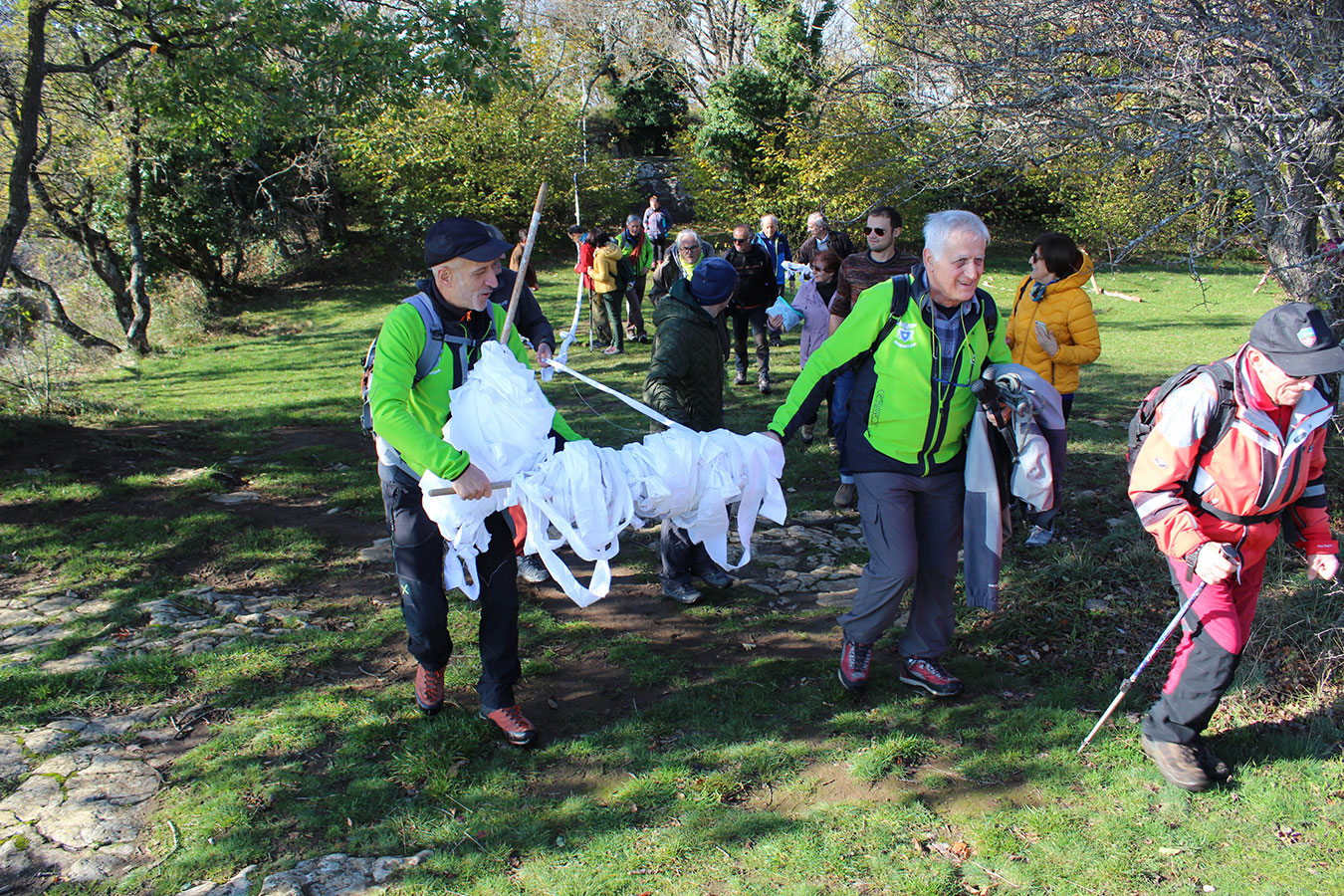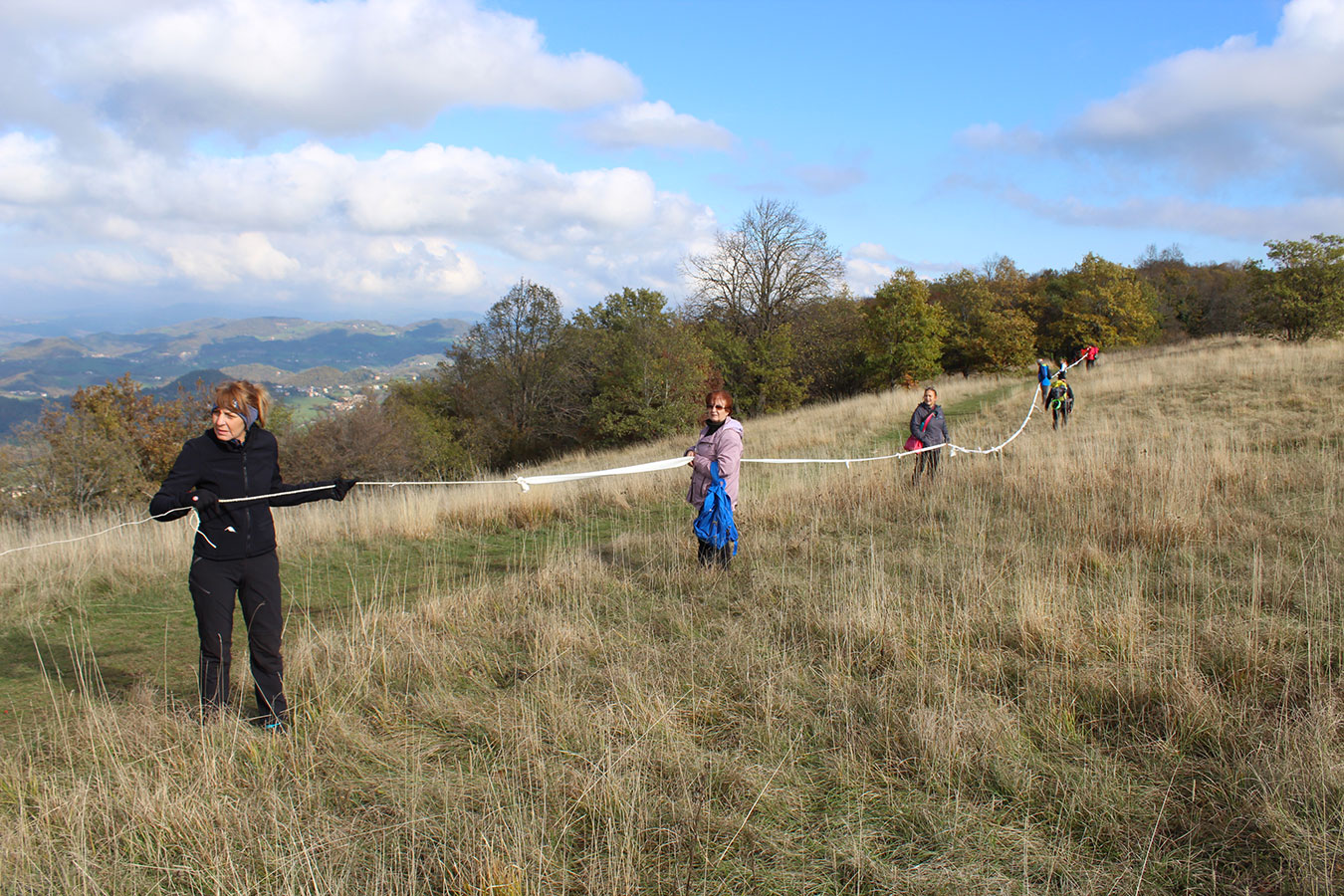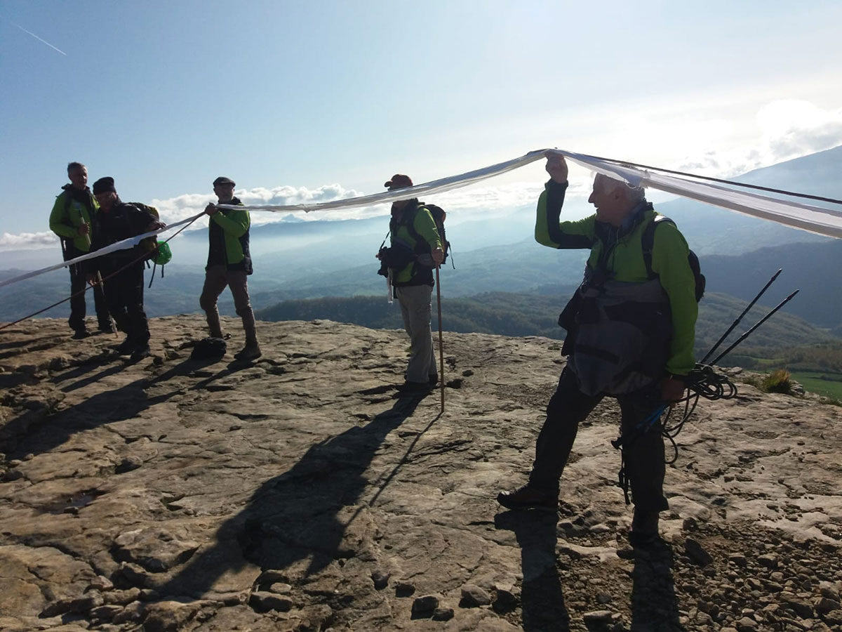 Una bella giornata di sole, non troppo fredda, ha rappresentato il contesto ideale per l’evento “Legarsi alla Pietra”, che si è svolto domenica mattina a Bismantova. Da un’idea dell’artista Ermanio Beretti, è nato questo evento di “arte relazionale”, che è stato insieme anche di Land Art, e che ha coinvolto circa 100 persone nel ruolo di “performer”, chiamati a sorreggere 3 km di una “fune povera” realizzata con lenzuola, vecchie corde, funi da arrampicata annodate, realizzata nelle scorse settimane con ben 1500 nodi. La performance ha preso corpo sul Pianoro sommitale della Pietra di Bismantova la vigilia del giorno dedicato a San Martino. “Siamo stati fortunati” ha spiegato Ermanio alla chiusura dell’ultimo nodo che ha chiuso il cerchio. “Come dice il vecchio adagio contadino l’estate di San Martino dura tre giorni e un pochino, così abbiamo avuto in dono un giorno limpidissimo e insieme ci siamo annodati e accordati a questo luogo, simbolo di una relazione profonda tra sacro e natura. Ricordiamoci che ogni modo corrisponde a un pensiero: oggi ne possiamo formulare tanti, tornando a casa. Sono infatti 1500 i nodi che ho fatto alle vecchie lenzuola”. La gente ha risposto alla chiamata e in circa cento persone si sono radunate in piazzale Dante verso le 10 del mattino. Afferma l’assessore alla Cultura di Castelnovo, Emanuele Ferrari: “All’evento erano presenti le due sezioni CAI di Castelnovo Monti e Reggio Emilia, alcuni esponenti dei Gruppi di Cammino, appassionati di trekking, giovani e famiglie, insegnanti e le due dirigenti delle scuole superiori, cittadini che insieme a Ermanio hanno srotolato 3 km di lenzuola ridotte in strisce e annodate, offerte gentilmente dalla ditta Ellebi di Luca Benassi. Molti anche i contributi di persone accorse sul posto con bende, vecchie corde, anche da arrampicata: tra tutti il materiale più originale è stato senza dubbio costituito da vecchie fasce da neonato ricamate: su una di queste, proprio in prossimità del nodo finale, la scritta “Cuor Mio”, a chiudere anche simbolicamente il cerchio di una giornata che probabilmente continuerà a battere davvero nel cuore di ciascuno dei partecipanti”.