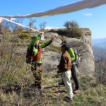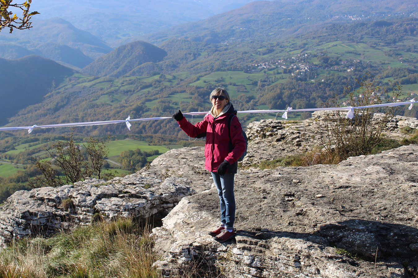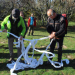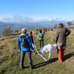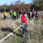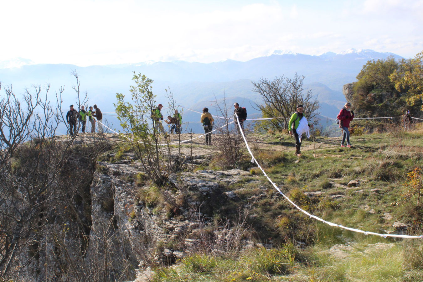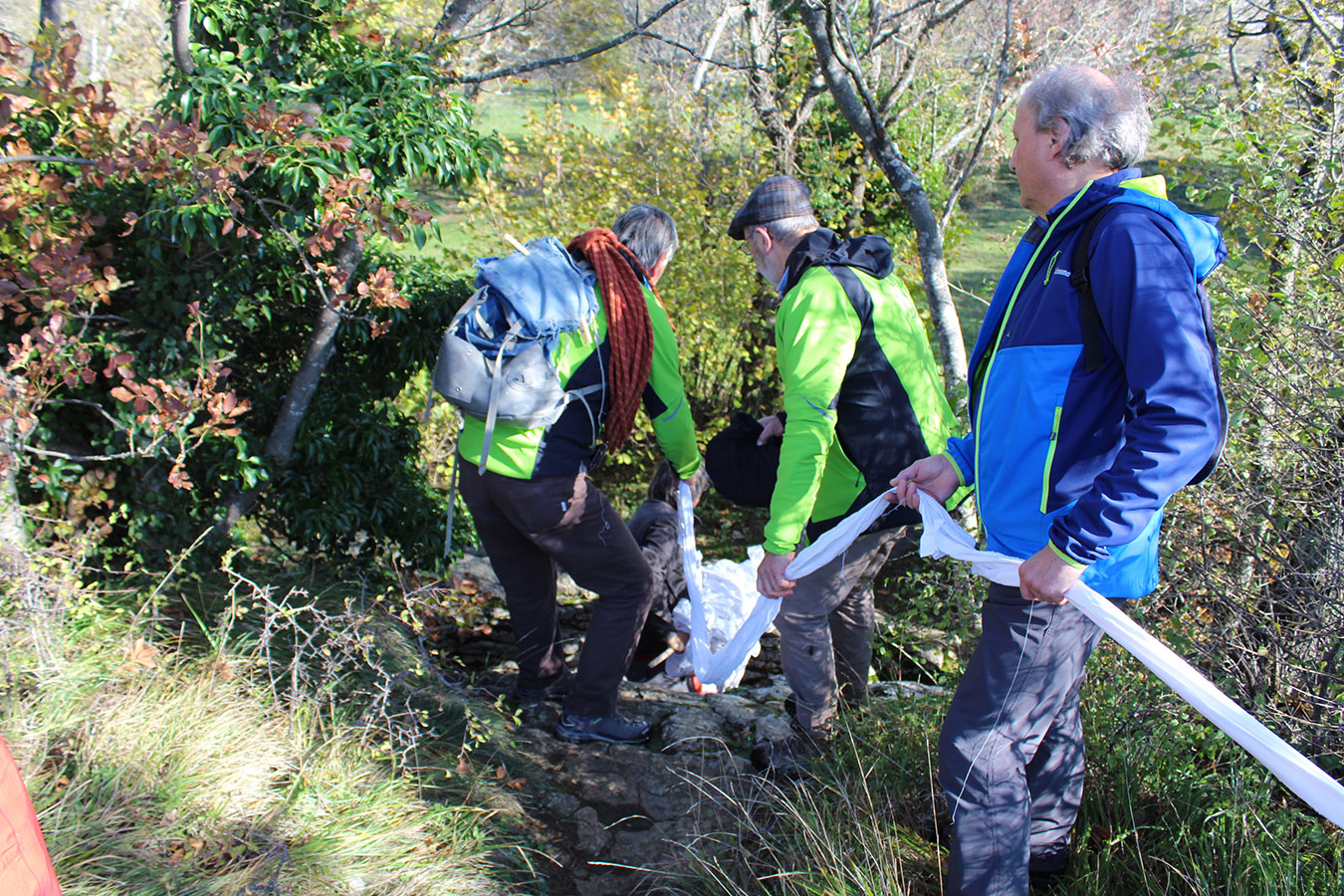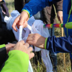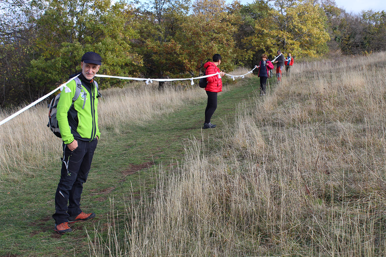 Una bella giornata di sole, non troppo fredda, ha rappresentato il contesto ideale per l’evento “Legarsi alla Pietra”, che si è svolto domenica mattina a Bismantova. Da un’idea dell’artista Ermanio Beretti, è nato questo evento di “arte relazionale”, che è stato insieme anche di Land Art, e che ha coinvolto circa 100 persone nel ruolo di “performer”, chiamati a sorreggere 3 km di una “fune povera” realizzata con lenzuola, vecchie corde, funi da arrampicata annodate, realizzata nelle scorse settimane con ben 1500 nodi. La performance ha preso corpo sul Pianoro sommitale della Pietra di Bismantova la vigilia del giorno dedicato a San Martino. “Siamo stati fortunati” ha spiegato Ermanio alla chiusura dell’ultimo nodo che ha chiuso il cerchio. “Come dice il vecchio adagio contadino l’estate di San Martino dura tre giorni e un pochino, così abbiamo avuto in dono un giorno limpidissimo e insieme ci siamo annodati e accordati a questo luogo, simbolo di una relazione profonda tra sacro e natura. Ricordiamoci che ogni modo corrisponde a un pensiero: oggi ne possiamo formulare tanti, tornando a casa. Sono infatti 1500 i nodi che ho fatto alle vecchie lenzuola”. La gente ha risposto alla chiamata e in circa cento persone si sono radunate in piazzale Dante verso le 10 del mattino. Afferma l’assessore alla Cultura di Castelnovo, Emanuele Ferrari: “All’evento erano presenti le due sezioni CAI di Castelnovo Monti e Reggio Emilia, alcuni esponenti dei Gruppi di Cammino, appassionati di trekking, giovani e famiglie, insegnanti e le due dirigenti delle scuole superiori, cittadini che insieme a Ermanio hanno srotolato 3 km di lenzuola ridotte in strisce e annodate, offerte gentilmente dalla ditta Ellebi di Luca Benassi. Molti anche i contributi di persone accorse sul posto con bende, vecchie corde, anche da arrampicata: tra tutti il materiale più originale è stato senza dubbio costituito da vecchie fasce da neonato ricamate: su una di queste, proprio in prossimità del nodo finale, la scritta “Cuor Mio”, a chiudere anche simbolicamente il cerchio di una giornata che probabilmente continuerà a battere davvero nel cuore di ciascuno dei partecipanti”.